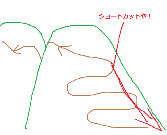そのため、途中確認した「足跡をたどって戻れば大丈夫」から「斜面を真っ直ぐ降りれば早いんじゃね?」というショートカットコースを思いついたんです。